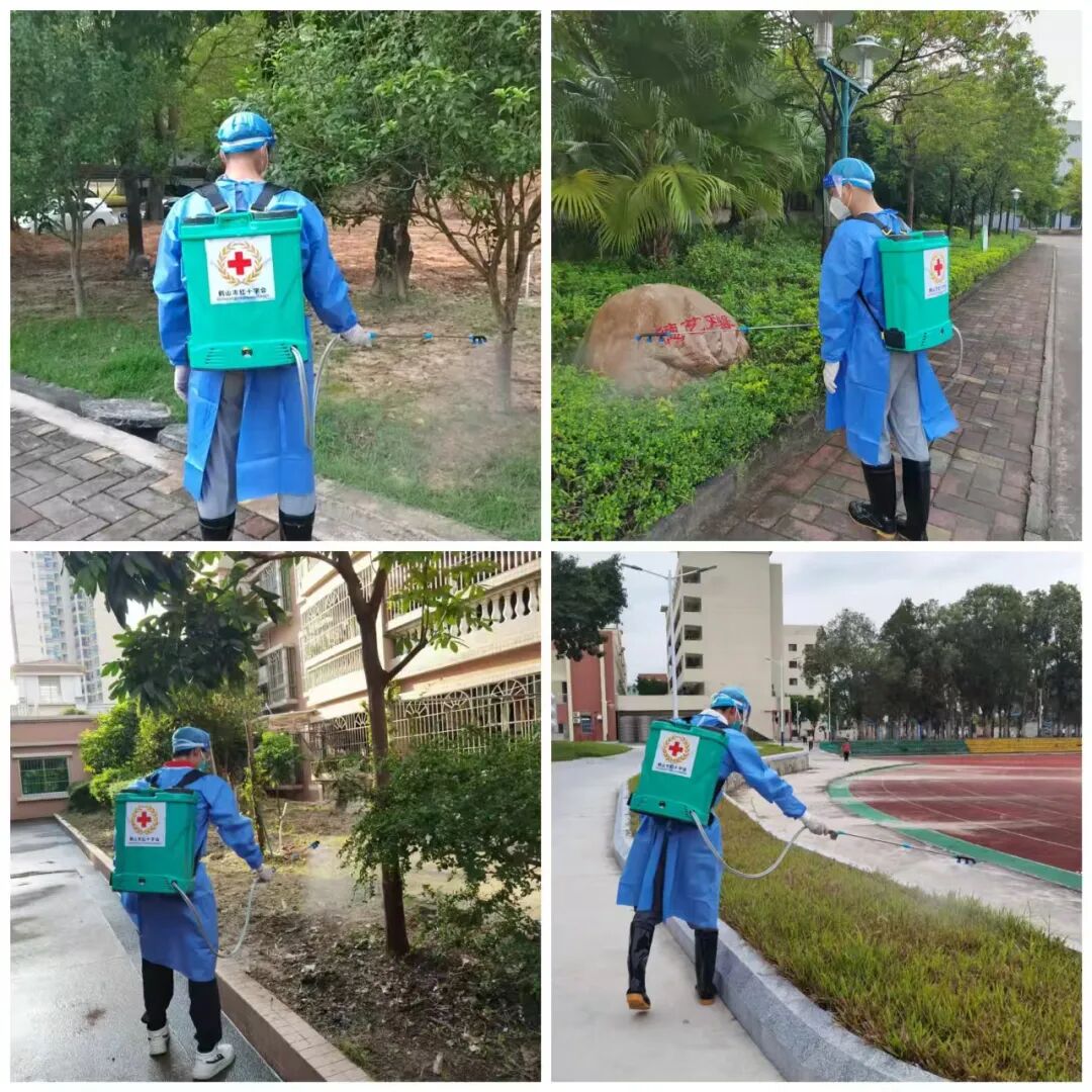 消杀志愿服务队的志愿者更是勇挑重担,背负几十斤重的消杀药箱走街串巷开展消杀工作。