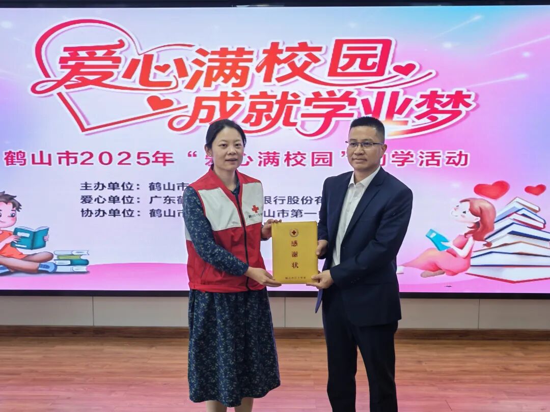 市红十字会向鹤山农商银行颁发感谢状,向市教育局移交助学金爱心牌,推动善款精准落地。据了解,2025年该活动共筹集善款22万元,其中10万元来自鹤山农商银行捐助,12万元源于社会捐赠及“红十字爱心储蓄罐”学生爱心捐款,将定向资助全市167名困境学子。