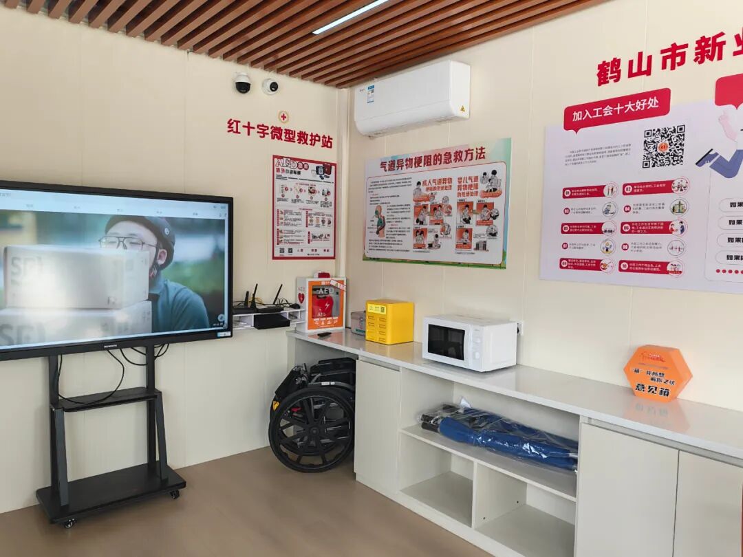 这座藏在工会新业态服务中心里的“迷你驿站”,别看空间不大,“干货”可不少:除了专业的 AED 设备,还有急救知识宣传墙,从气道异物梗阻急救到AED使用,覆盖了生活中常见的应急场景。
